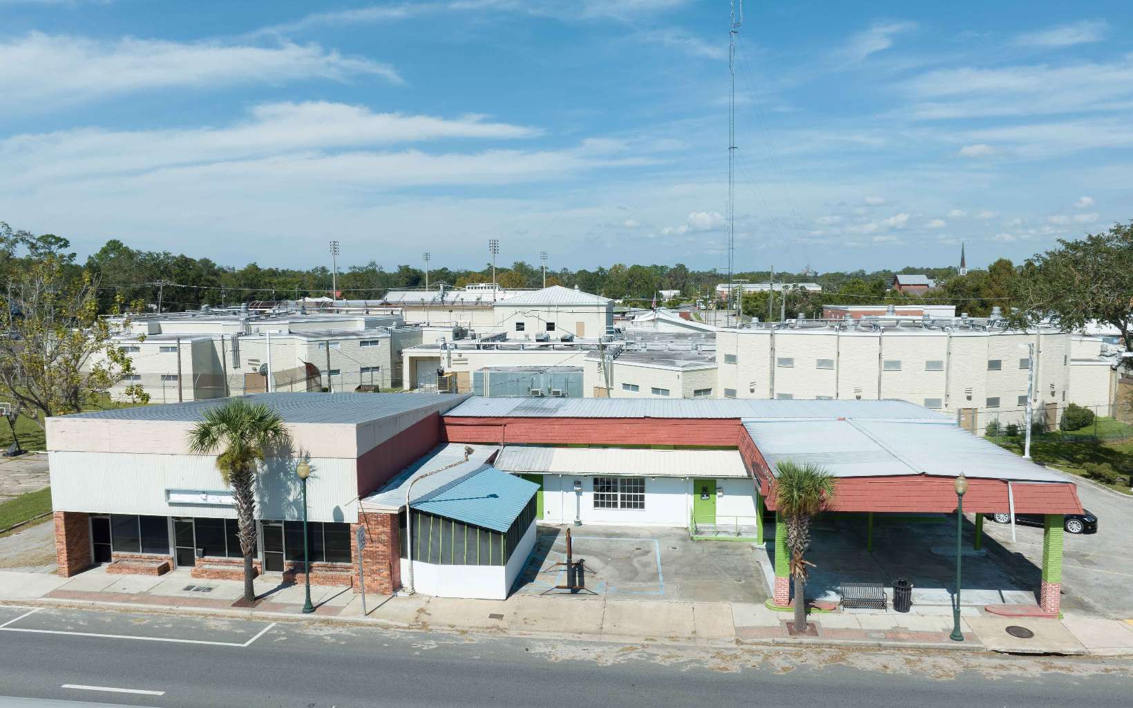 Exceptional commercial real estate opportunity in the heart of Downtown Live Oak. This property comprises two distinct buildings (one was a restaurant and the other has 3 separate office spaces), each offering unique possibilities for entrepreneurs and investors alike. One building formerly a successful restaurant, this space is equipped with a commercial kitchen (some fixtures still in place, like the hood vent, prep area, sink), dining area, and bar. Ample seating capacity and room for expansion outdoors. The adjoining building offers 3 retail/office spaces with full exposure to Hwy 129. Don't wait!