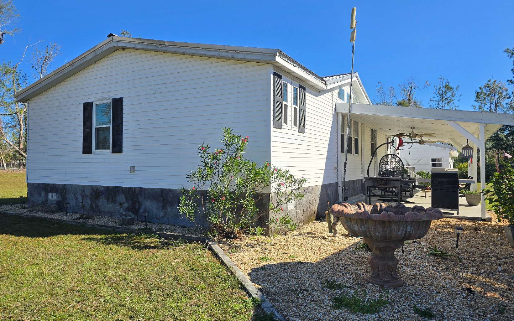 This 4-acre homestead comes with complete freedom! You'll feel warmly invited by the great layout on this 3 bed, 2 bath Palm Harbor home built with 2'x6' walls. Enter into a tiled foyer, large living room, dining room, vaulted ceilings, with tons of natural light from the transom windows. Granite counter tops and center island in a luscious kitchen includes a full appliance package. Spacious owner's suite features walk-in closet, double sink and spa tub. Additional heated/cooled 40' x 44' building features mini kitchen, full bath, fireplace, and vaulted ceilings! The covered patio in the back is the perfect spot to sip sweet tea! Parking under the pole barn, the detached garage or any of the open spaces around the 2nd power pole or the multiple entrances. The above ground pool with wrap around deck stays open year-round in Sunny Florida. The Gazebo with swing and picnic table sits under a shade tree, and an inground fire pit is ready for the smore's. Property includes four contiguous lots with Highway 90 frontage, electric privacy gate, a second power pole and entrance. Ag2 zoning.