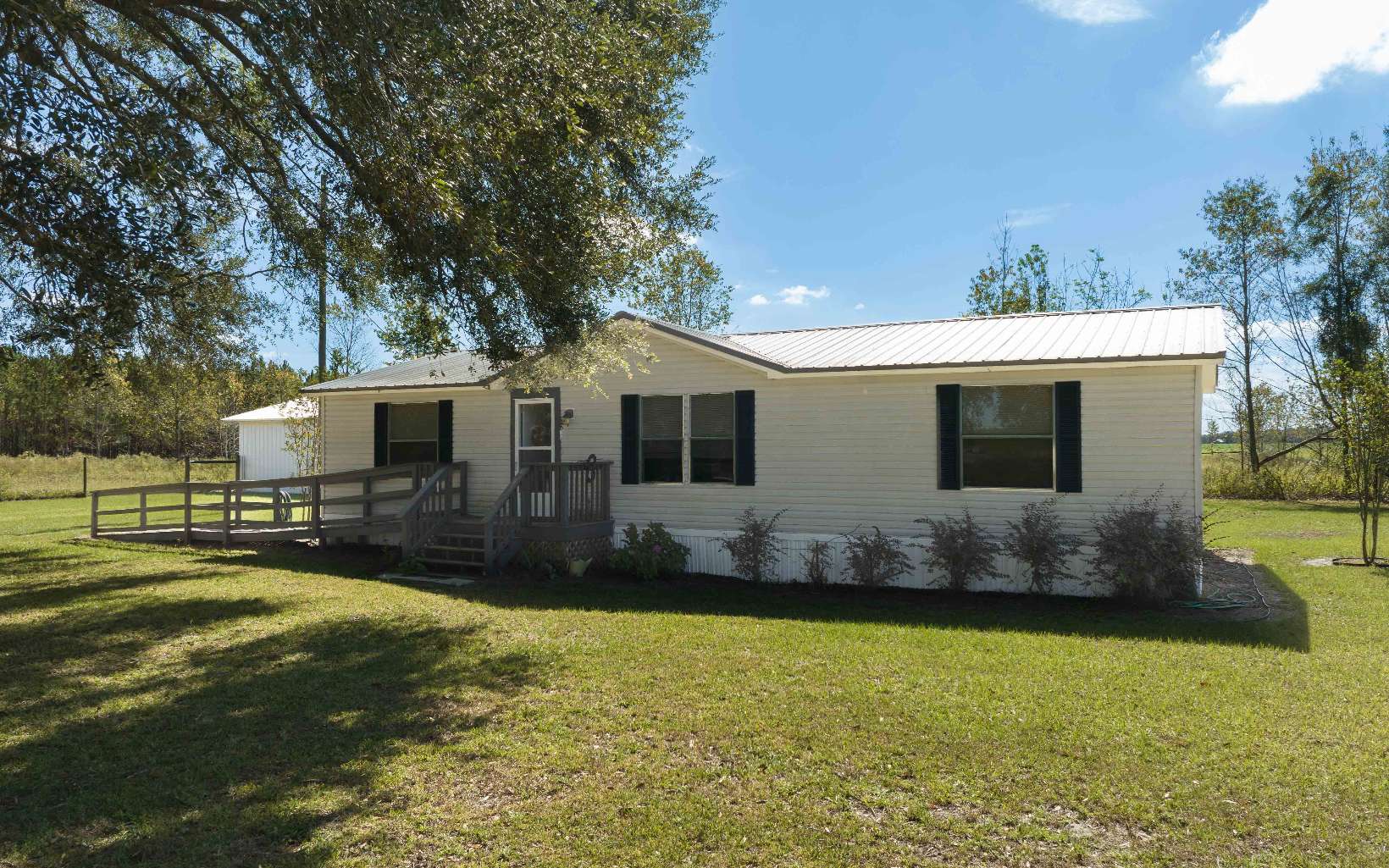 Come take a look at the beautiful home site with Live Oak trees, fenced in yard, handicap ramp, pole barn. This well-maintained manufactured home has a new shingle roof and the plumbing has been updated. Inside, open living space, cozy bedrooms, and upgraded kitchen cabinets provide comfort, making it an inviting haven for all. The property is cross-fenced and in mostly pasture, so farm animals are welcome.