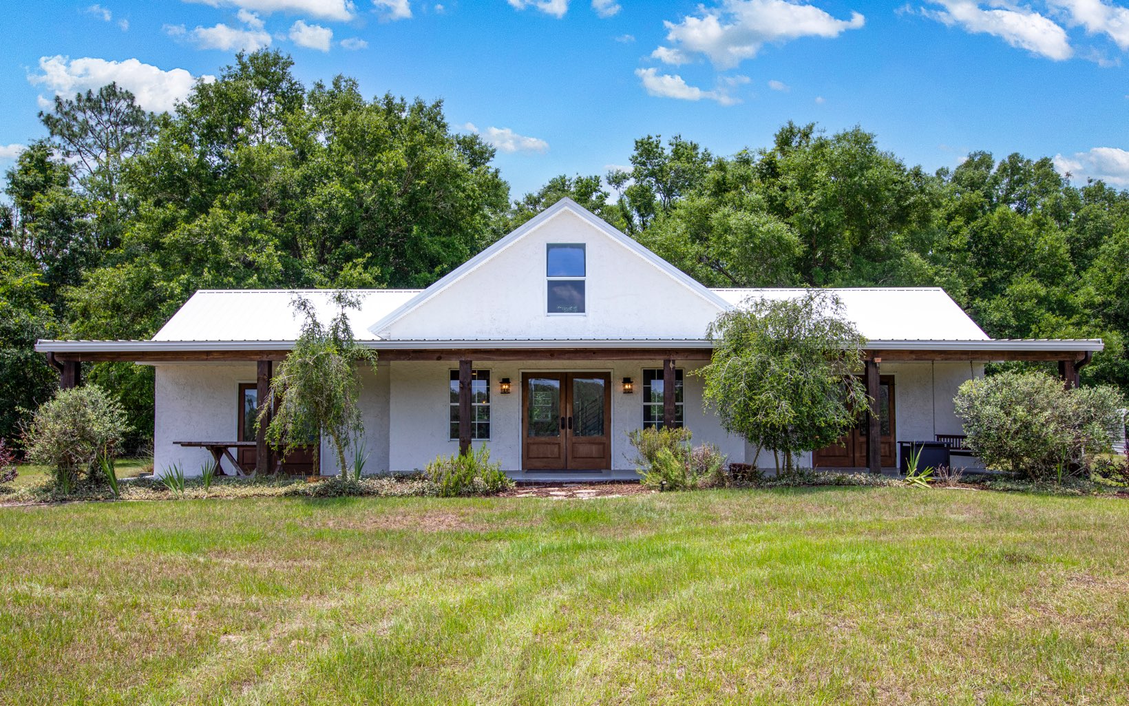 Back up offers welcome! Exceptional 40-acre farm property with a fully renovated 2-bedroom, 1.5-bath farmhouse just walking distance to the Suwannee River and a public boat ramp. This fully fenced North Florida acreage is ideal for horses, livestock, or a private country estate, offering a rare blend of modern upgrades & agricultural functionality. The charming farmhouse features a remodeled gourmet kitchen with marble countertops, stainless steel KitchenAid appliances, extra-large ceramic farmhouse sink, pantry, and premium cabinetry. Interior highlights include three sets of double doors overlooking scenic pastures, a unique spiral staircase, and a luxurious primary bathroom with custom tile accent wall, walk-in shower, deep soaking tub, and marble-top vanity. This home is equipped with a metal roof secured with lifetime stainless screws, a whole house water filtration system, and a new HVAC system installed in 2020. Enjoy outdoor living on the expansive 60-foot covered front porch finished with a new chip epoxy coating—perfect for relaxing or entertaining. The property also includes multiple outbuildings: a two-car metal carport, two metal storage sheds, and a large two-bay metal garage, all with electricity and some with 220V power and water access. Located in a peaceful rural setting just minutes from the Suwannee River.