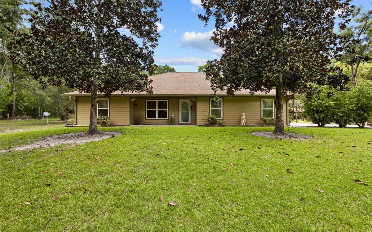 PRIVACY & BEAUTY abound at this 9.39 ACRES on a PAVED road just north of Bell, in the Rock Bluff area. Enter the property thru a brick column, iron gate driveway that winds to the custom 3 BD/2 BA CONCRETE BLOCK home also has hardiplank siding making it stronger and giving better insulation. The spacious home boasts 1,441 SF of living area and has a large covered back porch and attached garage, making 2,322 SF under roof. The split plan home offers 2 large bedrooms on one end of the home with bathroom between that has a 1920 antique pedestal sink. The Master Bedroom, with a private french door access to the back porch, has a nice walk-in closet and master bath with double sink vanity and walk in shower. The open concept living, dining, kitchen area is light and bright! The kitchen has an abundance of cherry wood cabinets and a prep sink, in addition to the double sink. The Corian countertops are maintenance free and durable. There is a pantry closet, next to the laundry closet, for added storage. A pleasant surprise at this property are the added buildings outside! A 12'x20' GUEST COTTAGE/"SHE SHED" is cute as can be with its front porch! A small kitchen area and bathroom and open living/sleeping area make it so convenient for guests. Another utility building with 2 wings is great storage for almost anything! In addition, there is another LARGE 36'x44' POLE BARN with concrete floor and includes a 15'x18' WORKSHOP. SEE PHOTOS FOR FULL PROPERTY DESCRIPTION.
