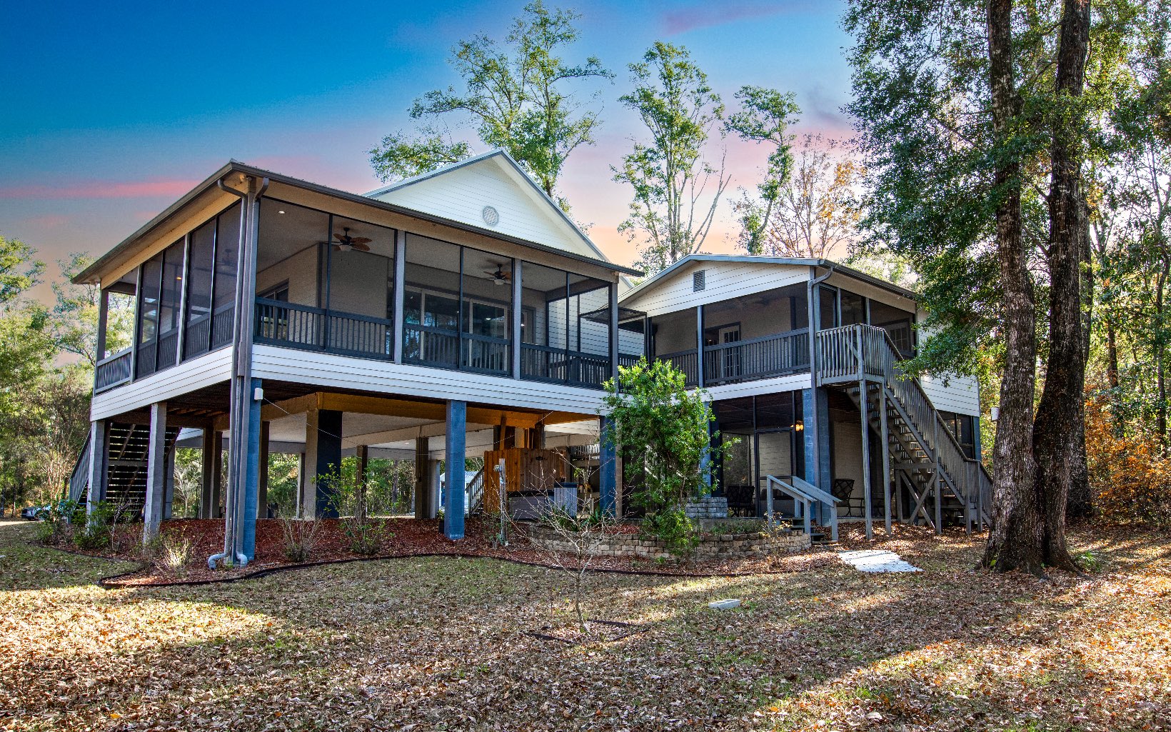 LISTED BELOW RECENT APPRAISAL VALUE! This beautiful river front home was built in 2016 and sits on 4.61 acres in a gated community just 2 miles from Gibson Park’s Suwannee River public boat ramp. The main home offers 2 bedrooms, 1 bath, hardwood floors, and an open living area with floor-to-ceiling glass doors. Two full walls of glass retracts behind the exterior walls, opening the living room to the wraparound screened deck/porch. The custom kitchen includes granite countertops, stainless steel appliances, brand-new dishwasher, and a large pantry. The Primary bedroom features a large walk-in closet and bathroom with double vanities and a tiled shower. Connected by the screened porch/deck, a guest cottage was added in 2023, giving you 2 more additional rooms and a full bath, ideal for visitors or multigenerational living. Exterior features include an elevator, outdoor shower, fire pit area, a large screened patio with half bath, oversized 2-car carport, GenX generator, water softener, pole barn, shed with electricity, and RV hookup. RV hookup wiring is present; breaker was redirected for the elevator and can be reconnected. Located approx. 15 minutes from I-75 and I-10. If you've been looking for your peaceful escape, come take a look today!